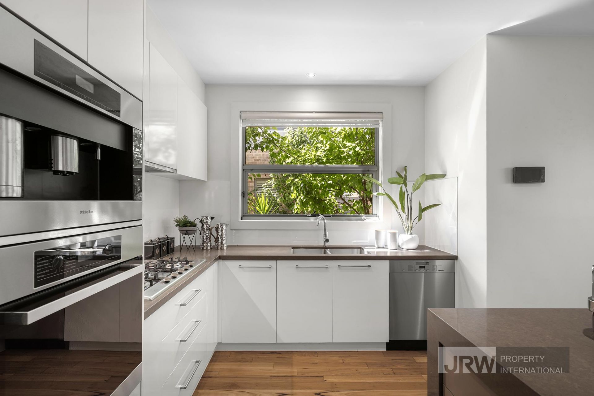 Timber floors carry you through the entry, where a formal lounge provides a quiet place to relax or unwind at the end of the day. Further inside, the home opens into a generous open-plan living and dining area centred around a stone waterfall island kitchen. Equipped with Miele appliances, including a five-burner gas cooktop, the kitchen balances practicality with a clean, modern feel while still keeping everyone connected. Sliding doors extend the space out to a private courtyard, creating a natural spot for entertaining, morning coffee or simply enjoying some fresh air.