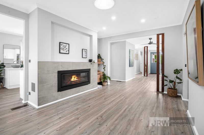 The heart of the home boasts an open-plan kitchen, living, and dining area, designed for both everyday living and entertaining. The kitchen is equipped with a 5-burner stovetop, perfect for culinary enthusiasts. The dining room and formal lounge room benefit from a Samsung split system air conditioner, ensuring year-round comfort. As you enter, you're greeted by an inviting foyer featuring a gas fireplace, adding warmth and character to the space.