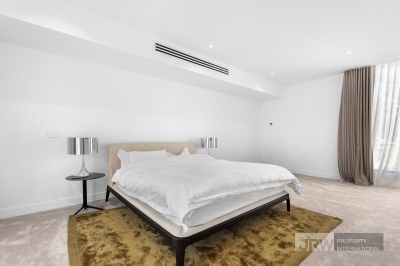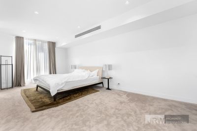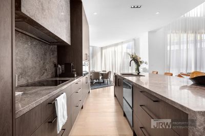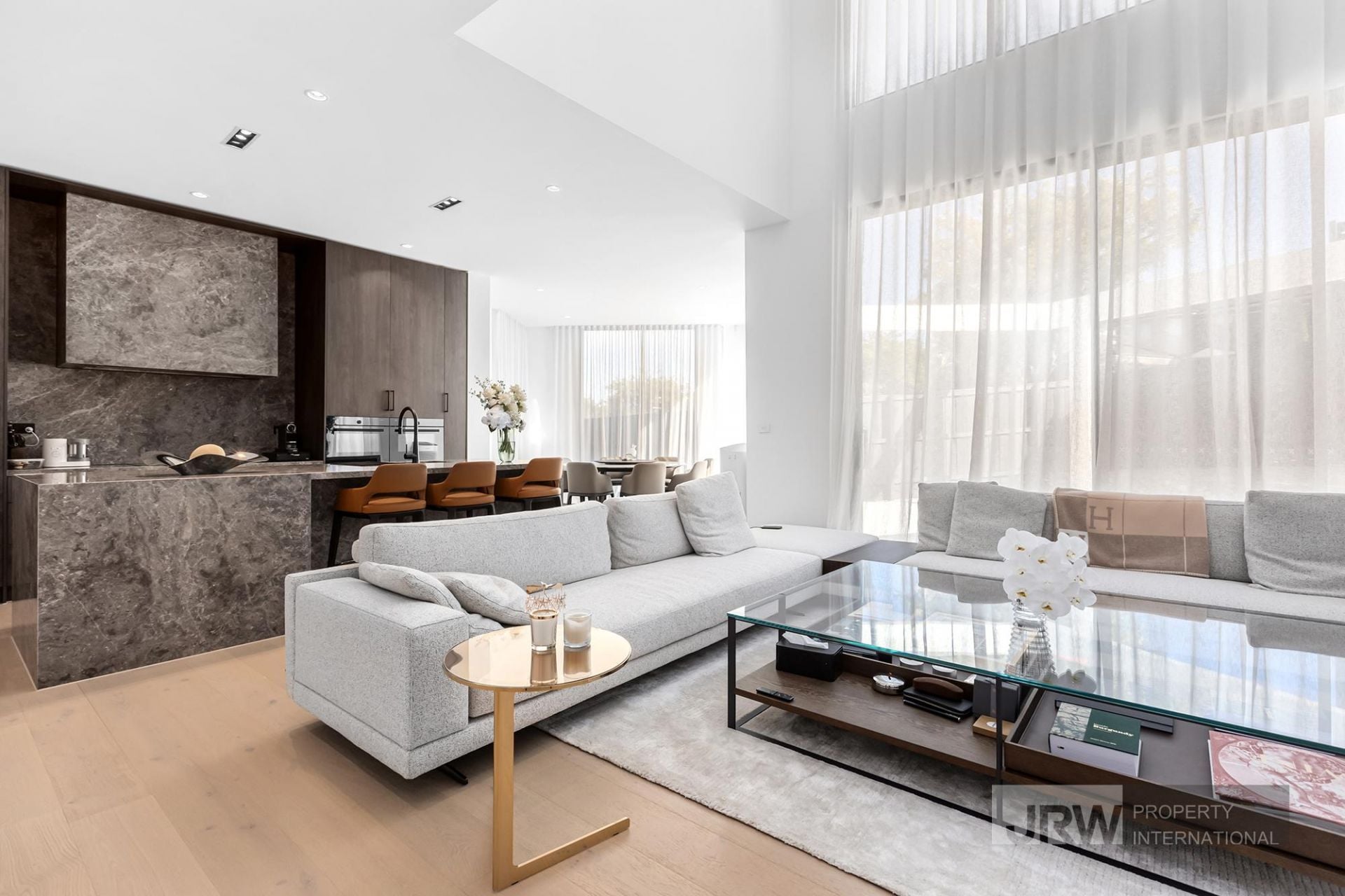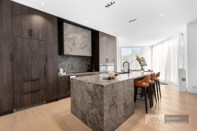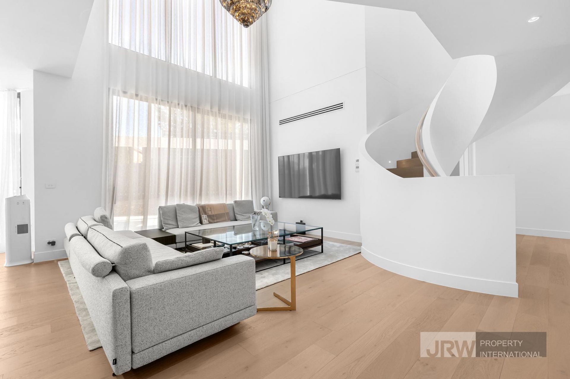 Step inside to soaring double-height ceilings, an elegant spiral staircase, and an expansive open-plan living zone that connects seamlessly to outdoor entertaining. The kitchen is an architectural showpiece, boasting bespoke timber cabinetry, marble benchtops and splashback, a butler's pantry, dual V-Zug ovens, an integrated fridge, and a dual-drawer dishwasher.