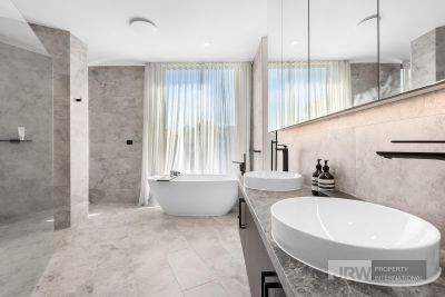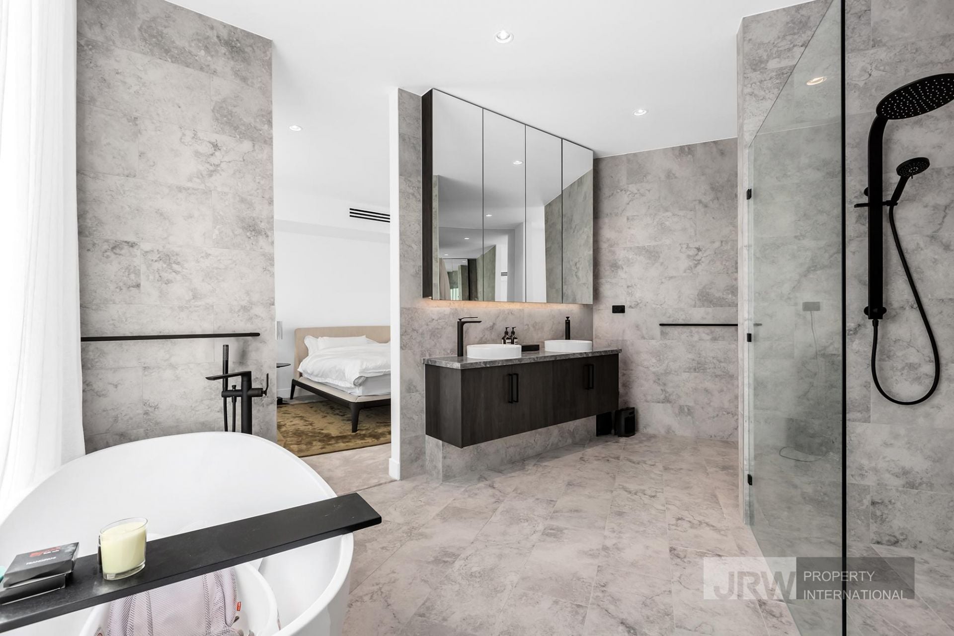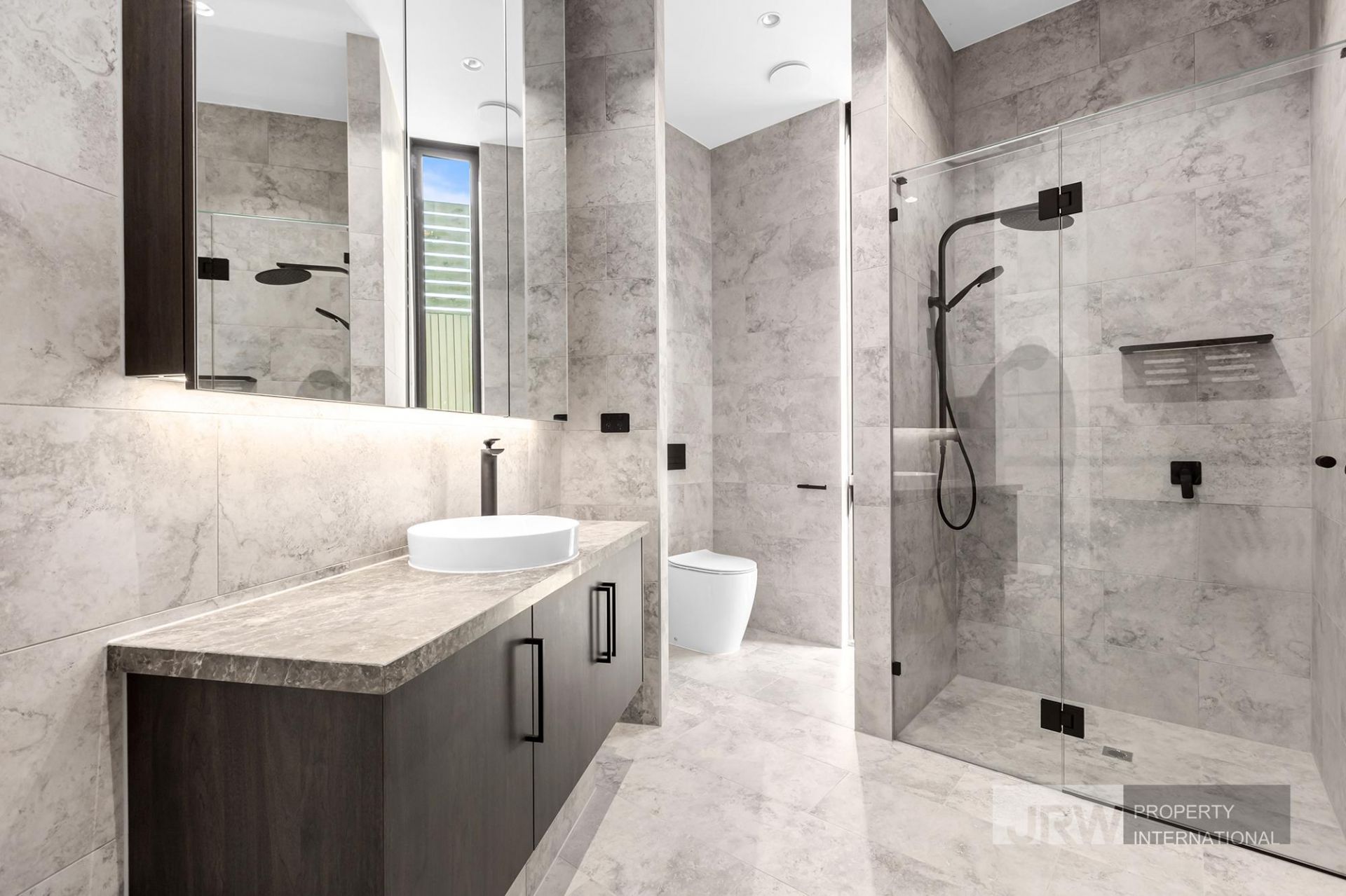 Upstairs, the master retreat exudes opulence, featuring a freestanding bathtub, dual vanities, and under-cabinet LED lighting. Each additional bedroom is equally impressive, with walk-in robes, ensuites, and floor-to-ceiling tiled bathrooms with frameless showers.