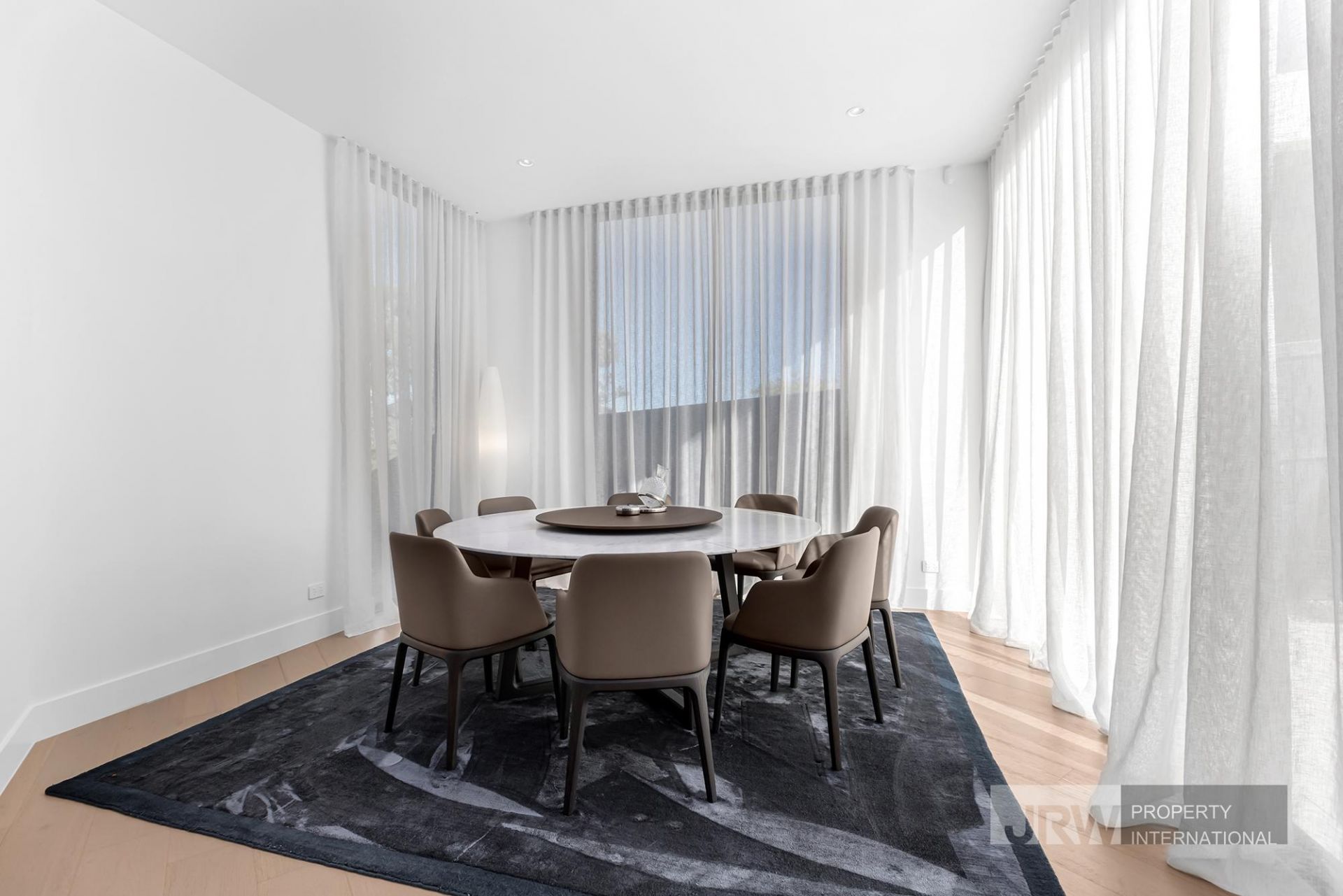 Flooded with natural light from expansive glass panels, the dining area is framed by three walls of windows, creating an intimate yet open space for entertaining. A ground-floor suite with an oversized walk-in robe and luxurious ensuite ensures flexibility for multi-generational living.