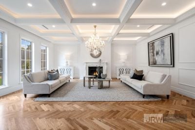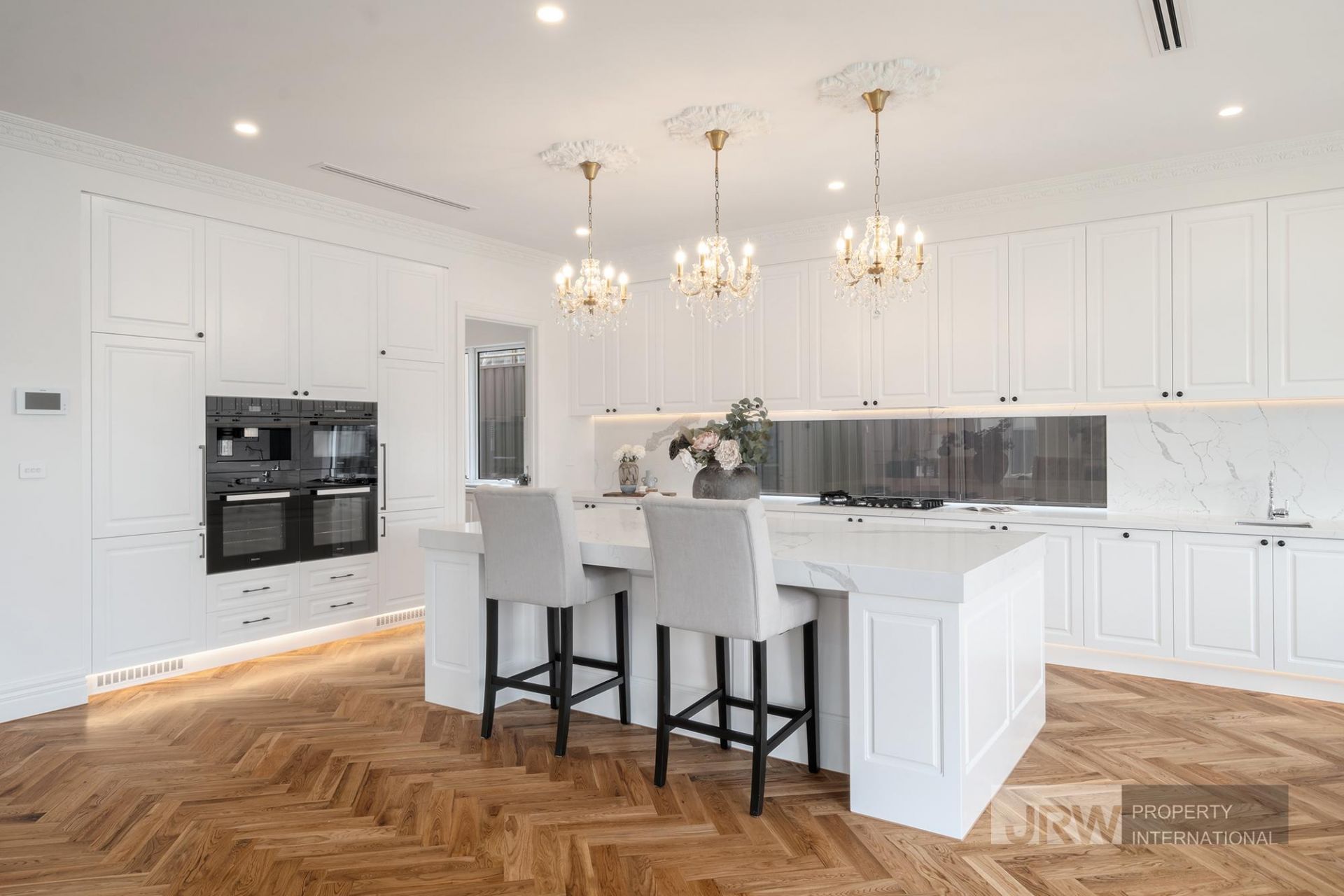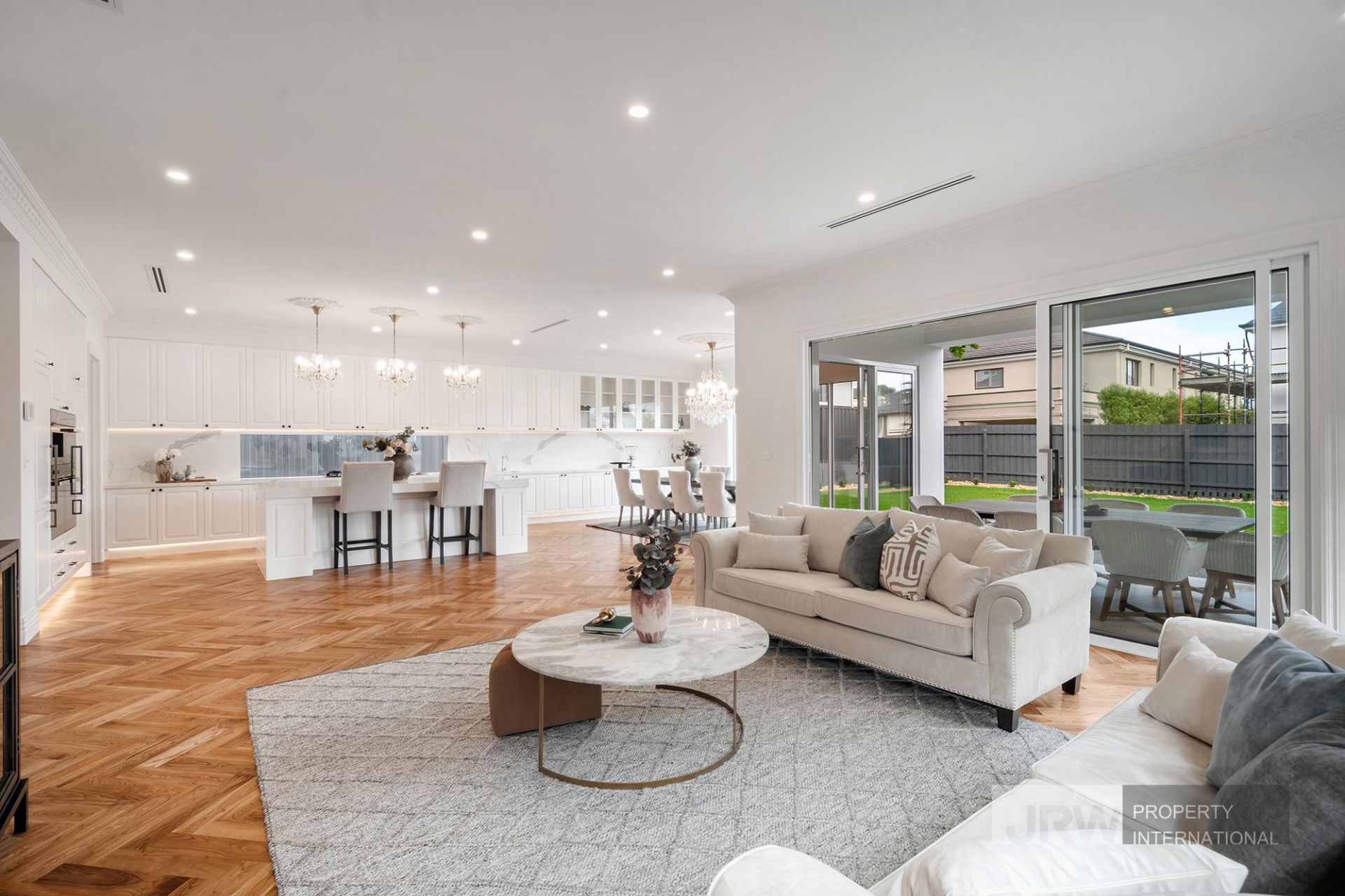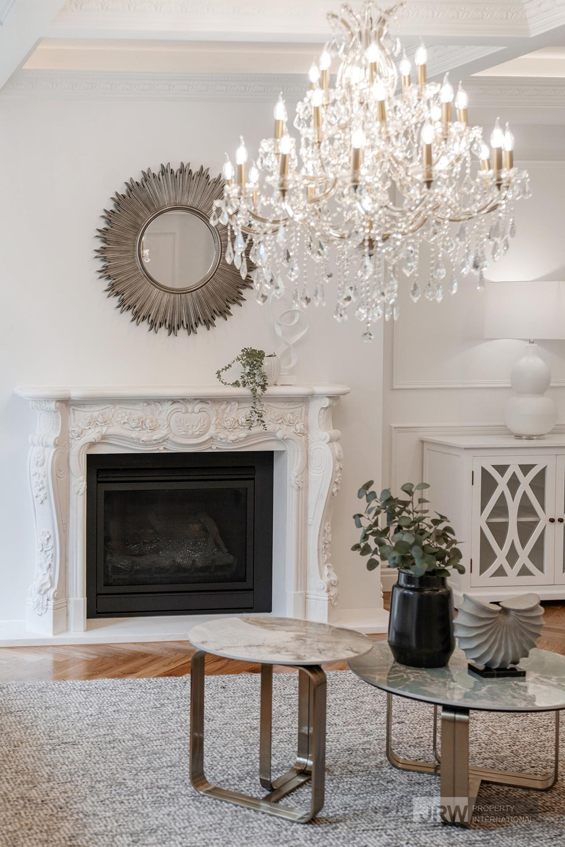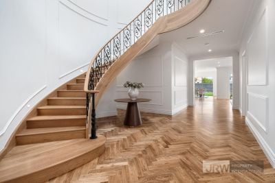 Embraced by sculpted gardens and an extravagant water feature, a driveway announces arrival at this French Provincial-inspired family residence - an exceptional meeting of architectural grandeur, privacy, and greenery. Step inside to be greeted by a magnificent spiral staircase with cast-iron balustrade, rising from a generous foyer beneath coffered ceilings. Herringbone parquetry flows across the entire ground level, guiding you past a gracious formal lounge and into a central heart where everyday life unfurls with poise.