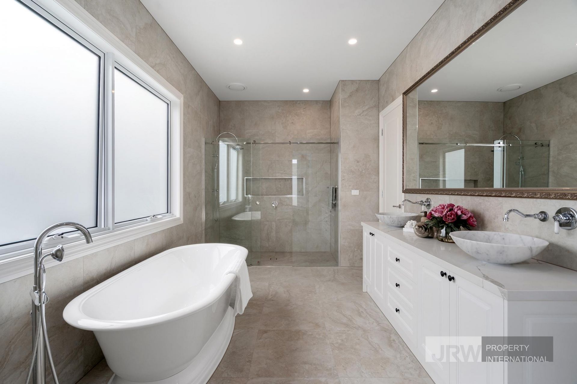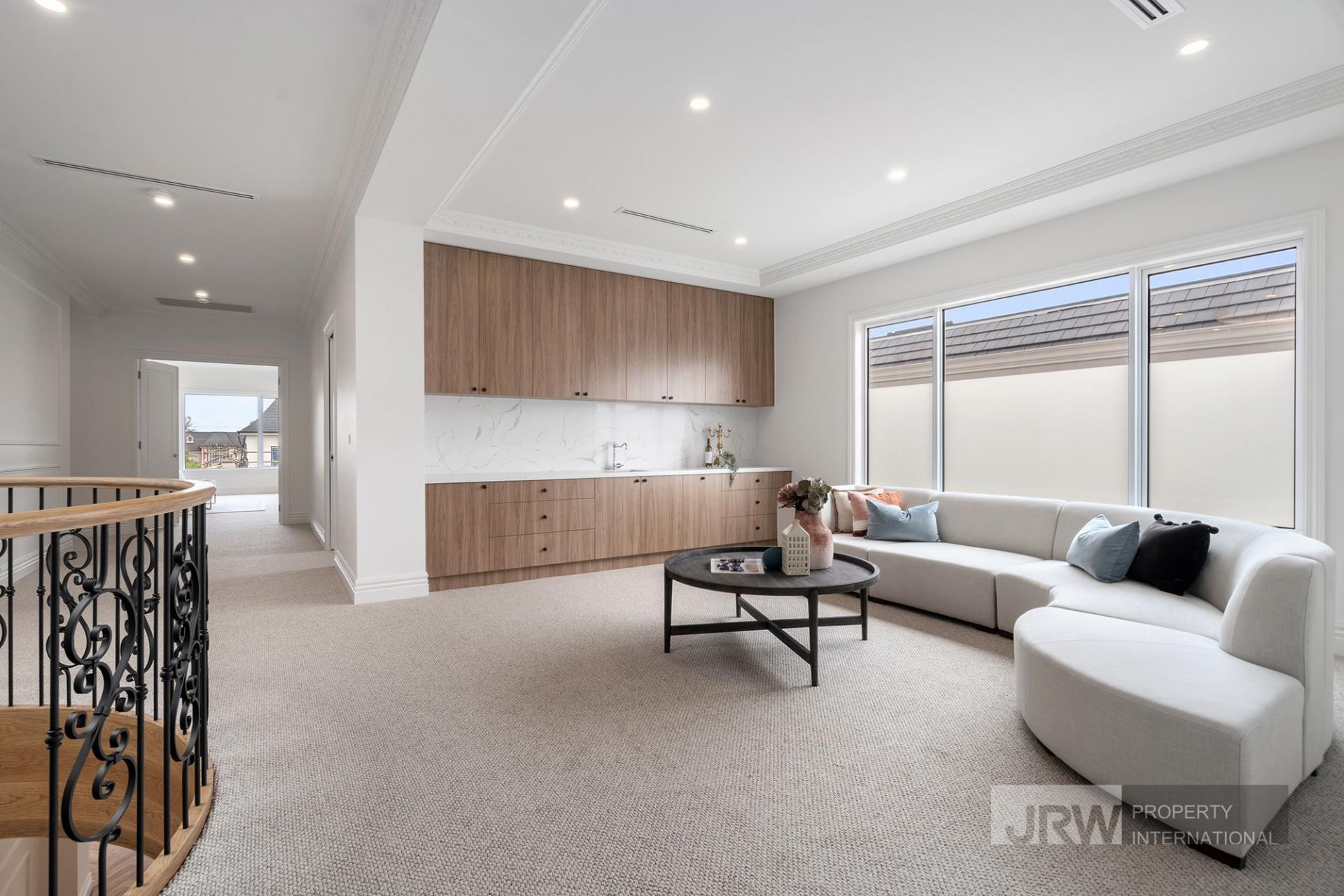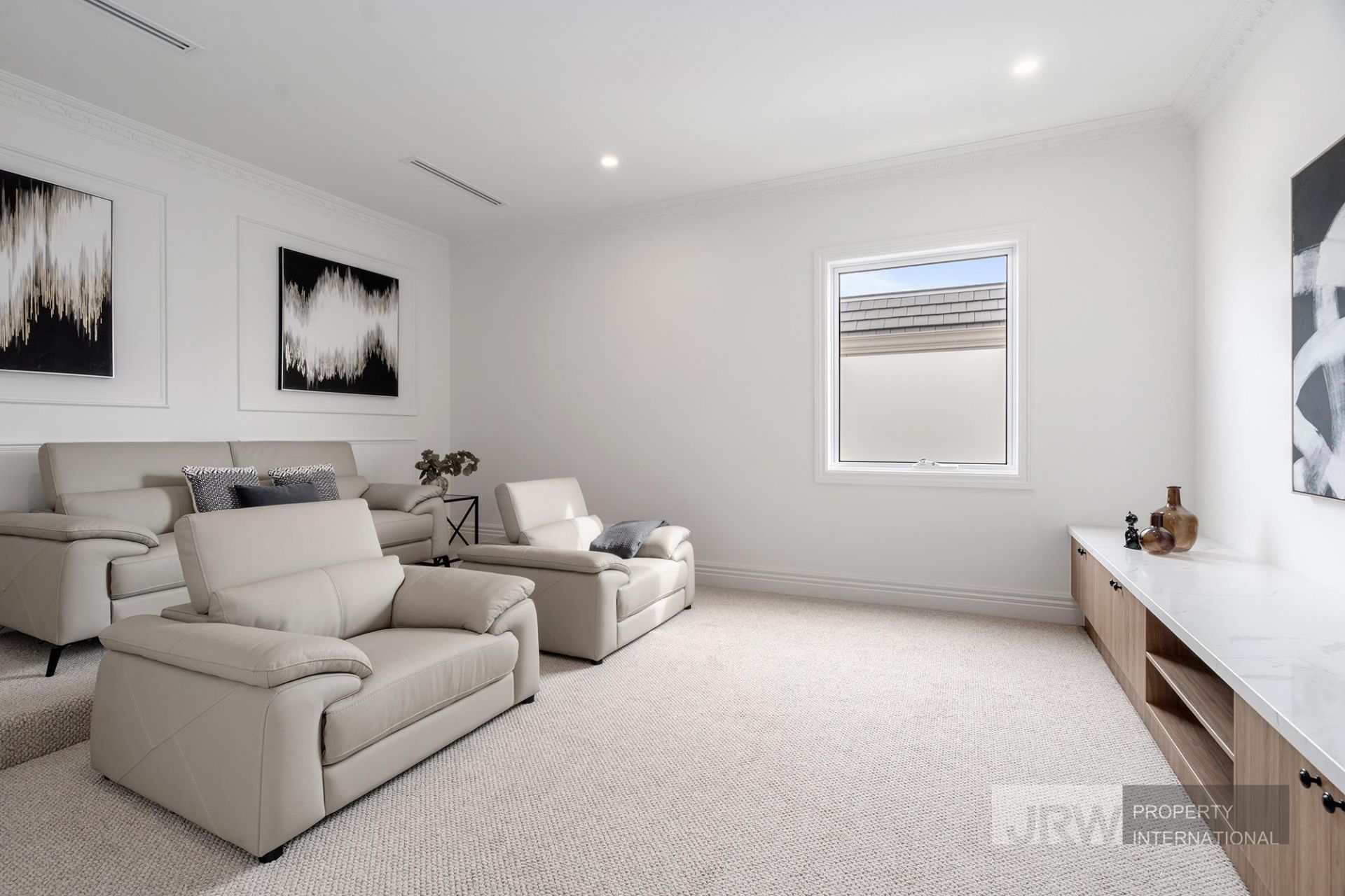 Accommodation is superb, offering five generous bedrooms, each appointed with its own walk-in robe and luxurious ensuite. One bedroom sits conveniently on the ground floor, while upstairs the palatial main suite boasts double-door entry, a freestanding bath, dual vanity, and a balcony accessed via the upstairs retreat. Frameless showers add contemporary elegance to every bathroom. Upstairs also reveals a secondary study, a dedicated cinema room, and a retreat with a wet bar for quiet evenings or lively entertaining. A large ground-floor study with floor-to-ceiling cabinetry and built-in desk enhances work-from-home ease.