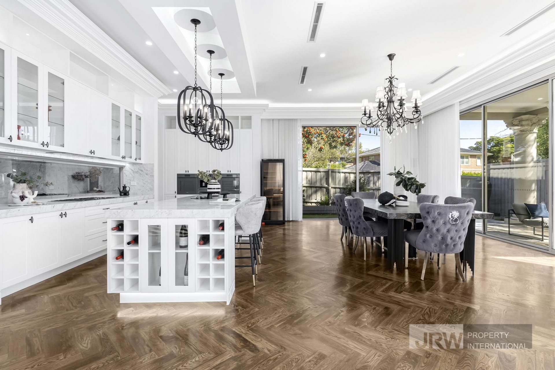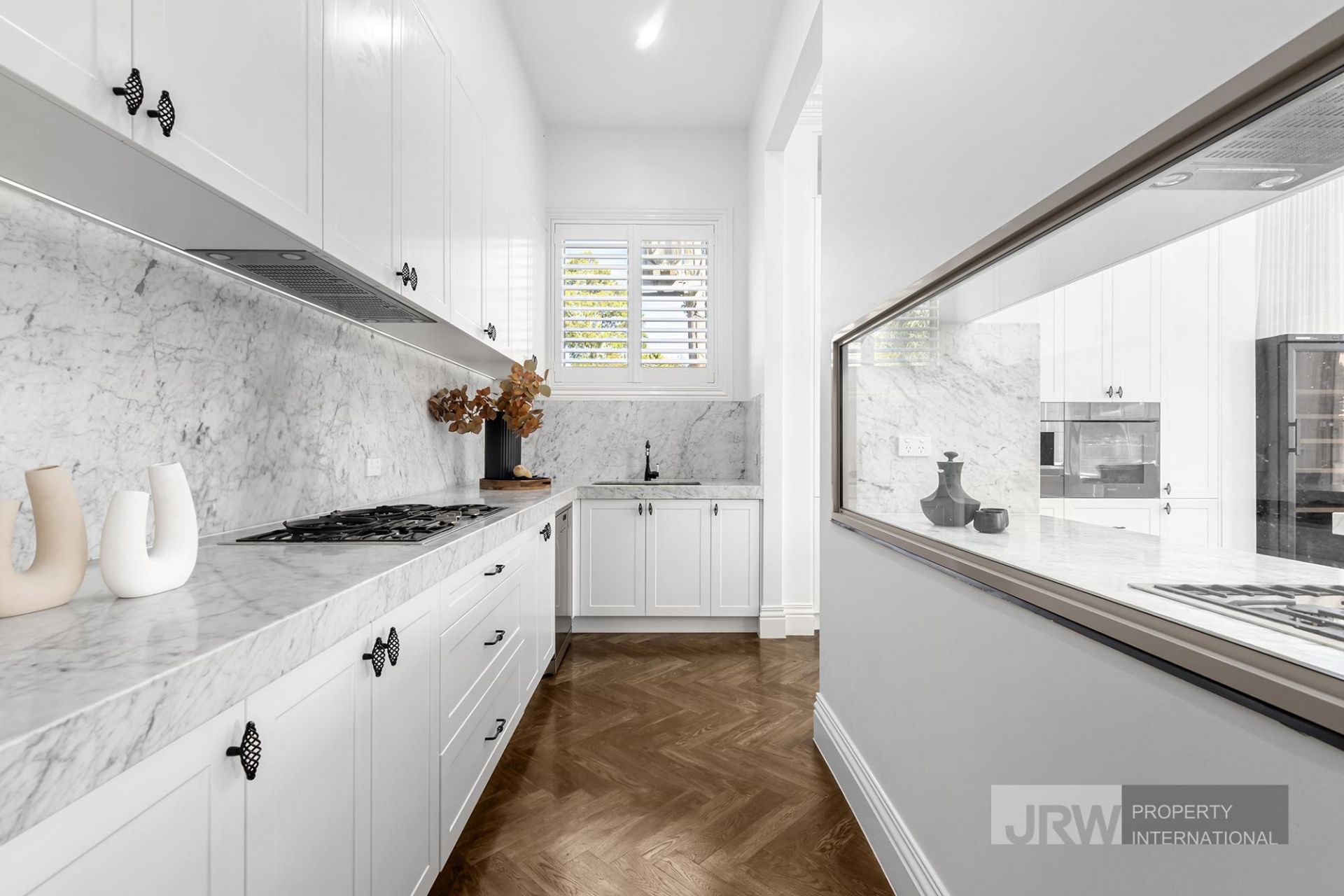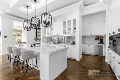Formal living spaces sit toward the front of the home, while the layout opens into an expansive rear living and dining domain designed for entertaining and everyday connection. At its centre, a statement kitchen combines beauty and performance with premium Miele appliances including dual ovens, two cooktops, an integrated coffee machine and extensive stone surfaces. A large island with breakfast bar seating is complemented by a fully equipped butler's pantry, while sliding doors extend the space seamlessly to a covered alfresco and landscaped garden.