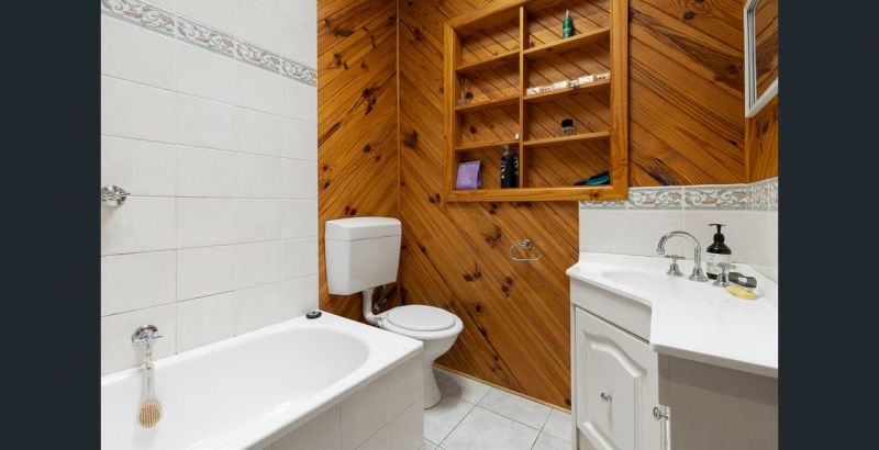 Accommodation comprises three bedrooms, including two with shared access to a powder room, along with a timber-lined, skylit central bathroom incorporating a second toilet. Outdoors, the beautifully private garden offers an ideal setting for relaxation, play or entertaining, and is enhanced by four rainwater tanks.